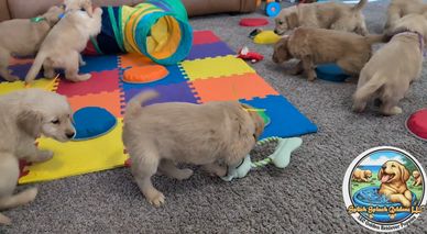 Golden Retriever puppies have moderate energy levels and require short, frequent play sessions. Avoid intense exercise until their bones are fully developed.
